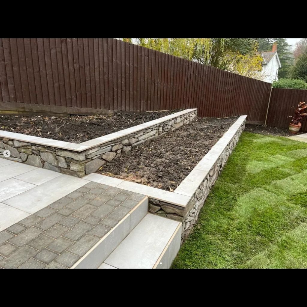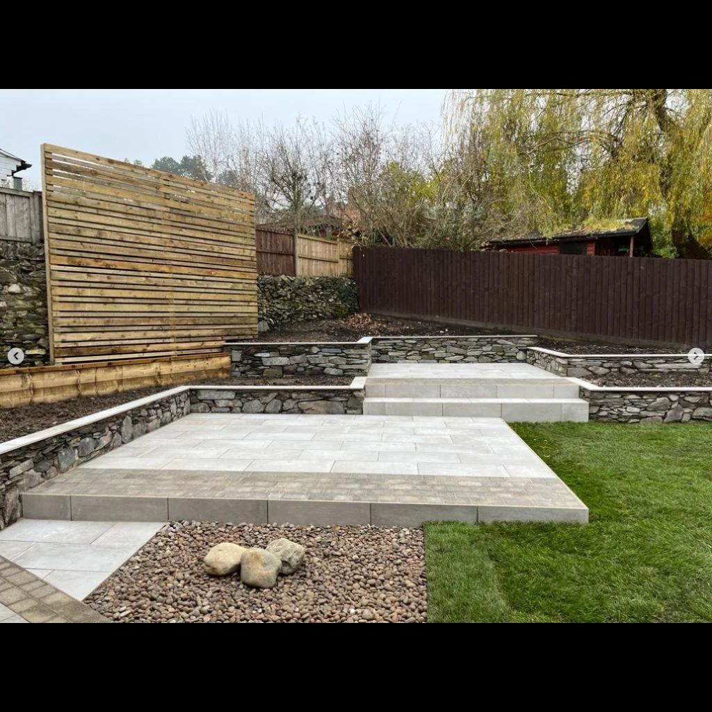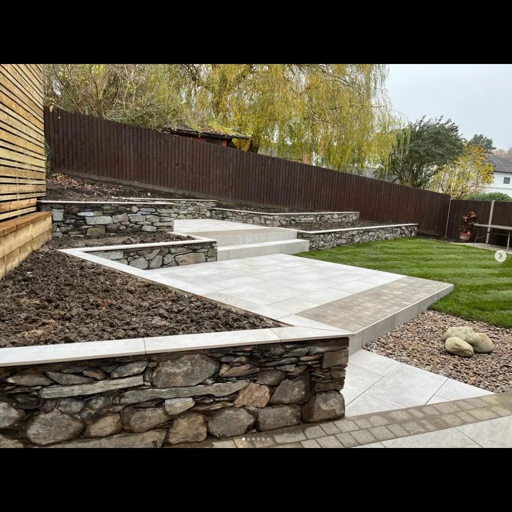 The rear garden, which had been previously terraced, wasn’t working for our clients. The existing terraces were too impractical to use and made the garden look and feel much smaller than it was. Our design was intended to maximise the available space by altering the layout of the terracing and utilising the opportunities this created. Using a series of retaining walls running diagonally across the garden and at various heights, helped to reduce the impact of the overall level change, create longer site lines and allowed us to create a series of linked seating areas and planting beds. Materials were selected to match the existing paving and Swithland slate walls in the garden. Looking forward to planting it up next year.