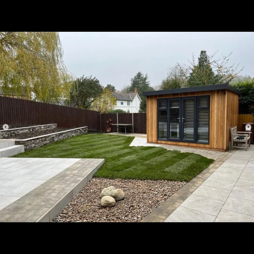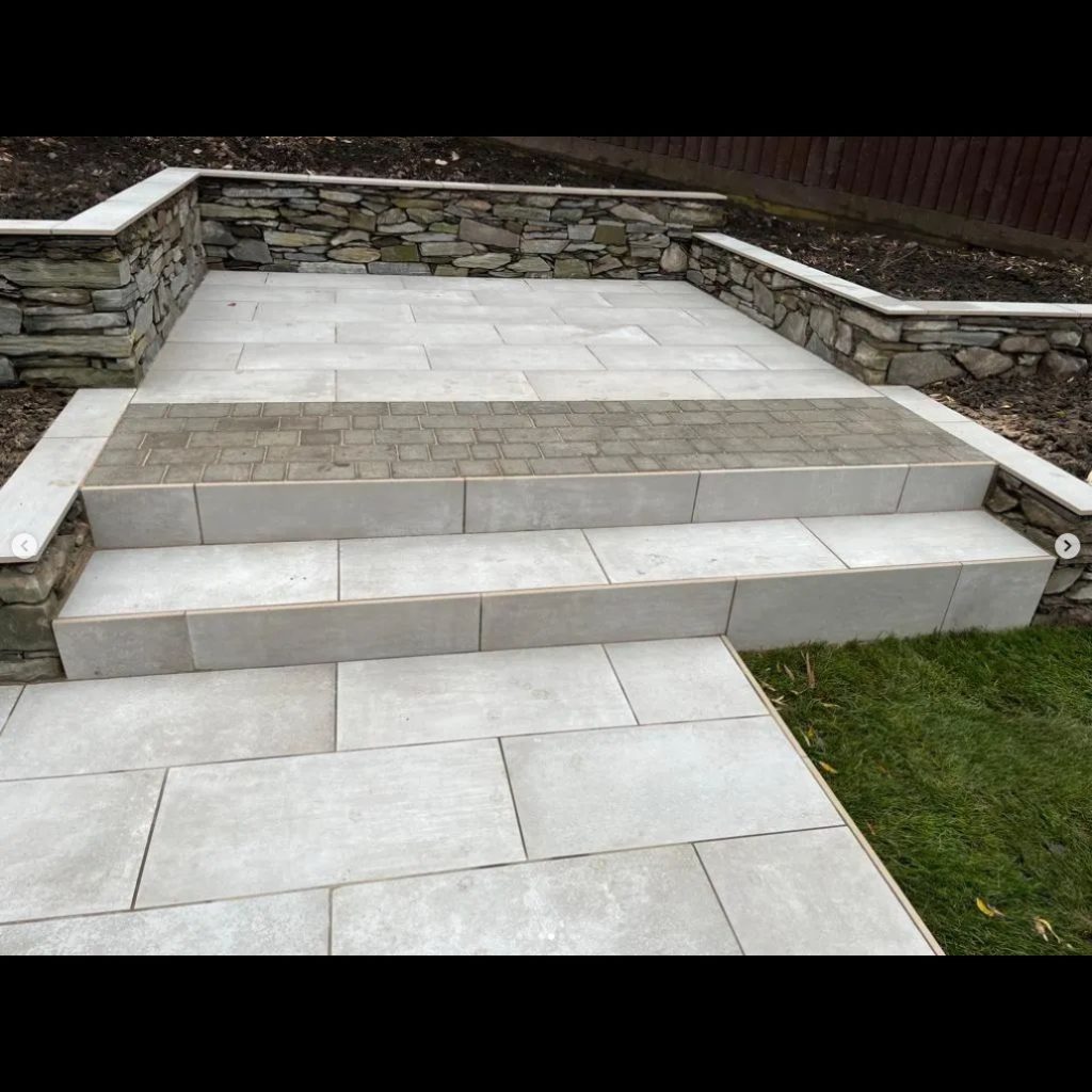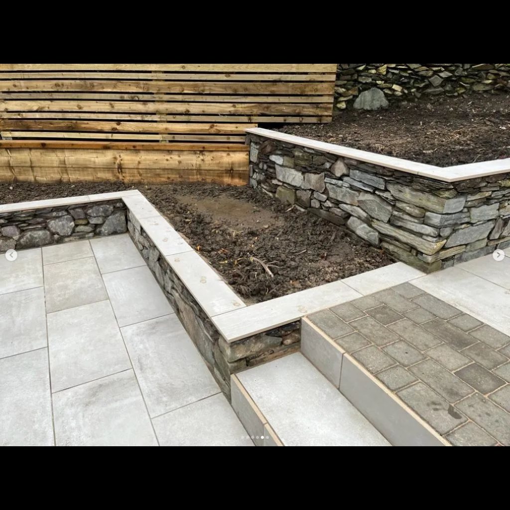 The rear garden, which had been previously terraced, wasn’t working for our clients. The existing terraces were too impractical to use and made the garden look and feel much smaller than it was. Our design was intended to maximise the available space by altering the layout of the terracing and utilising the opportunities this created. Using a series of retaining walls running diagonally across the garden and at various heights, helped to reduce the impact of the overall level change, create longer site lines and allowed us to create a series of linked seating areas and planting beds. Materials were selected to match the existing paving and Swithland slate walls in the garden. Looking forward to planting it up next year.